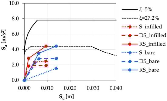 Once the target displacement (and the corresponding base shear force of the existing structure ) is assigned, the bilinear curve of the equivalent SDOF system is evaluated in the ADRS space, where the spectral coordinates are defined as (acceleration in m/s2) and (displacement in m), indicating the equivalent roof displacement at the PP as and the corresponding base shear and equivalent elastic stiffness as and , respectively.