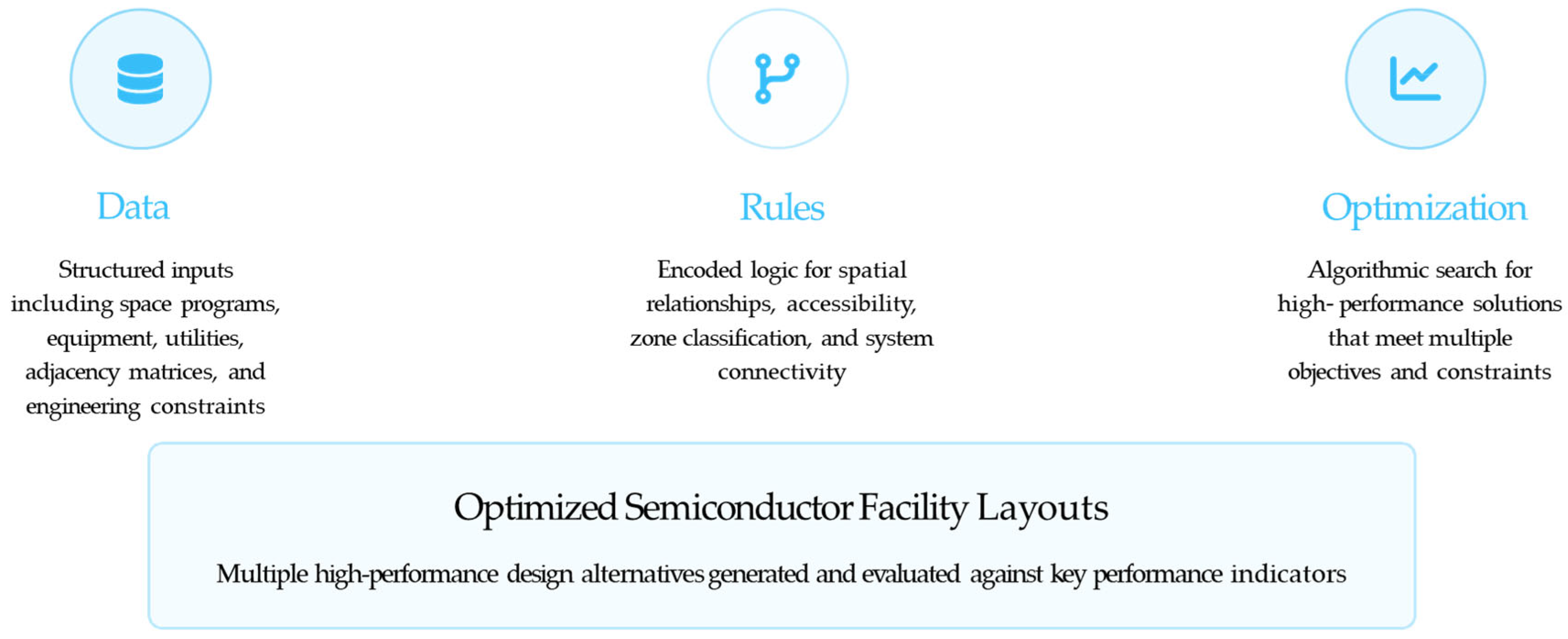 Figure 1. The entire process begins with the input of structured Data, such as space programs, equipment lists, utility requirements, and adjacency conditions. Next, Rules are defined to encode the logic governing the facility, including spatial relationships, maintenance accessibility, and cleanroom classifications. Finally, in the Optimization stage, the algorithms search a vast design space for high-performance solutions that satisfy multifaceted objectives and constraints. This process allows multiple high-performance alternatives to be generated and evaluated against key metrics, leading to rapid design iterations, cost reduction through optimized utility paths, enhanced operational efficiency, and improved space utilization.