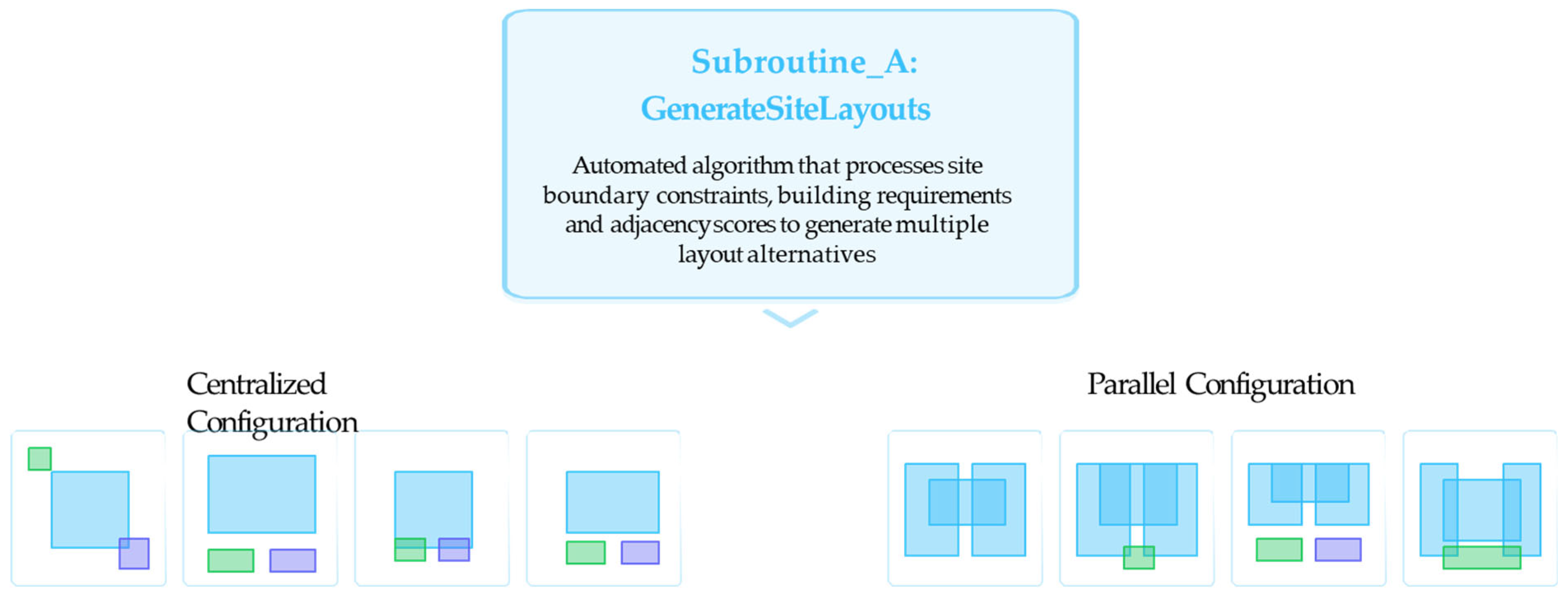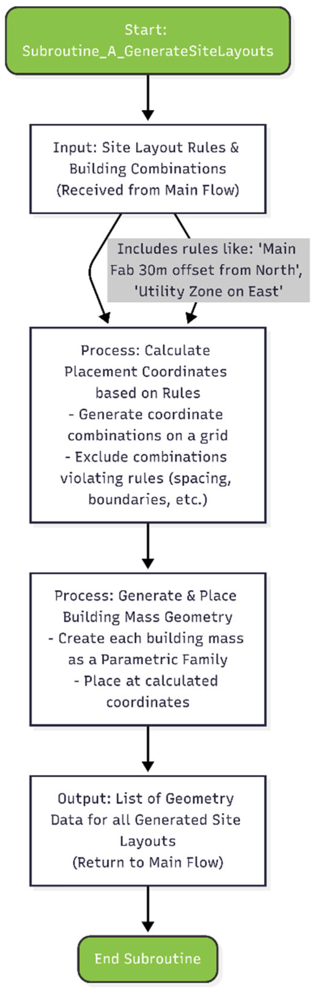 Figure 4. In this subroutine, the algorithm references the parametric site mass and structural grid defined in Revit to enumerate all the feasible site layout scenarios. Using grid coordinates and geometric constraints, Subroutine_A computes every combination of building placements that neither violates the site boundary nor allows interbuilding collisions. Each valid layout is recorded, completed with geometric metadata, and returned as a candidate for a detailed design. These candidate layouts represent all the spatially permissible arrangements of the fab’s main building, utility structures, and ancillary facilities.
