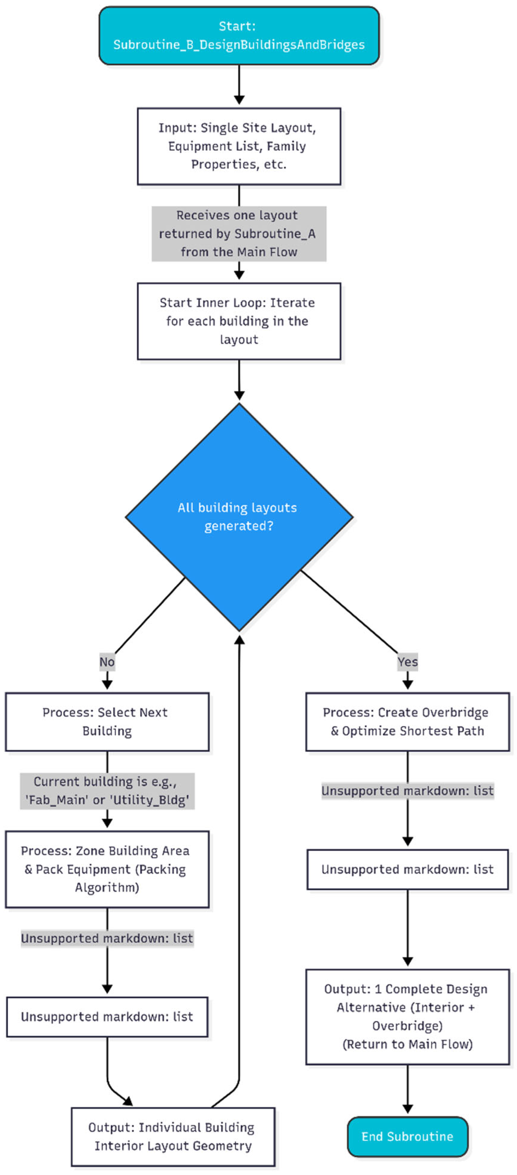 Figure 5, is invoked to generate an internal building plan and interbuilding connections. Subroutine_B begins by iterating through every building in the layout of the current site. For each building, it subdivides the interior into functional zones and then applies a packing algorithm that allocates equipment to those zones while respecting the clearance requirements, utility connection points, and adjacency rules. This packing operation relies on a Python script to manage complex spatial computations and ensure that no two pieces of equipment collide with each other. Once all buildings have been populated with equipment, Subroutine_B computes the overbridge connections between the structures. By evaluating cleanroom adjacency constraints and calculating the shortest-path routing, it generates a bridge geometry that efficiently links buildings. Each completed design alternative, comprising zoned interiors and an overbridge geometry, is then returned to the main workflow for evaluation.