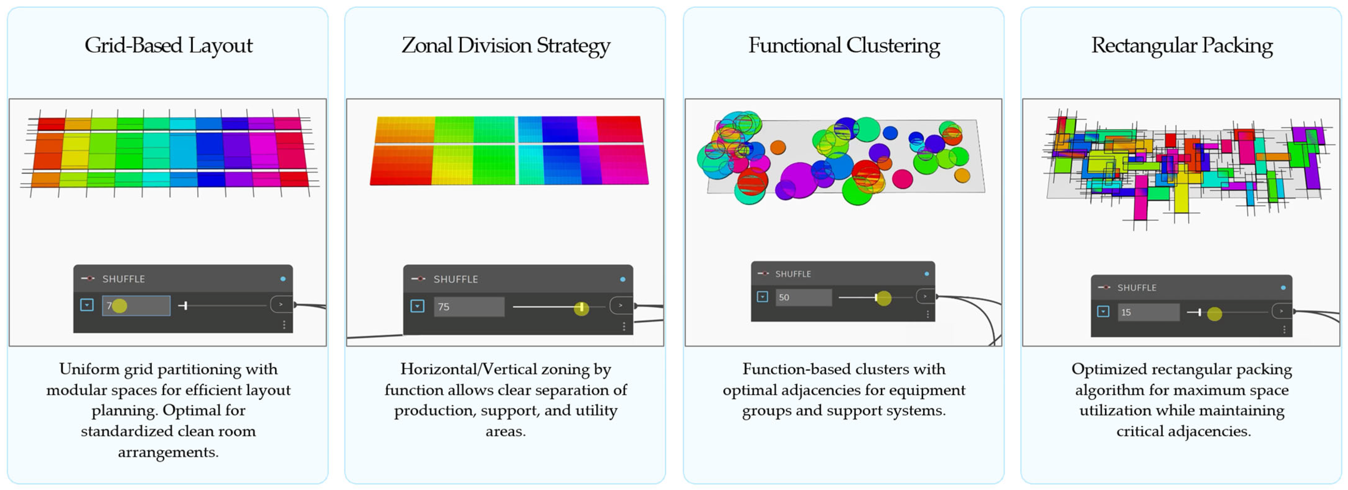 Figure 11 provides a conceptual visualization of the interior layout automation strategies employed by Subroutine_B. It showcases different spatial division algorithms, such as a grid-based layout with uniform modular spaces, functional clustering where related functions are grouped, and a rectangular packing algorithm that efficiently fits various spaces together. These examples illustrate how the subroutine’s packing algorithm and zonal logic can arrange internal elements, considering simplified requirements in the conceptual model that represent real-world constraints such as equipment size, cleanroom classifications, circulation paths, and maintenance access. This process signifies the deepening of design automation from the macro-scale (site) to the meso-scale (building interior), demonstrating the framework’s capability to handle detailed design problems.
