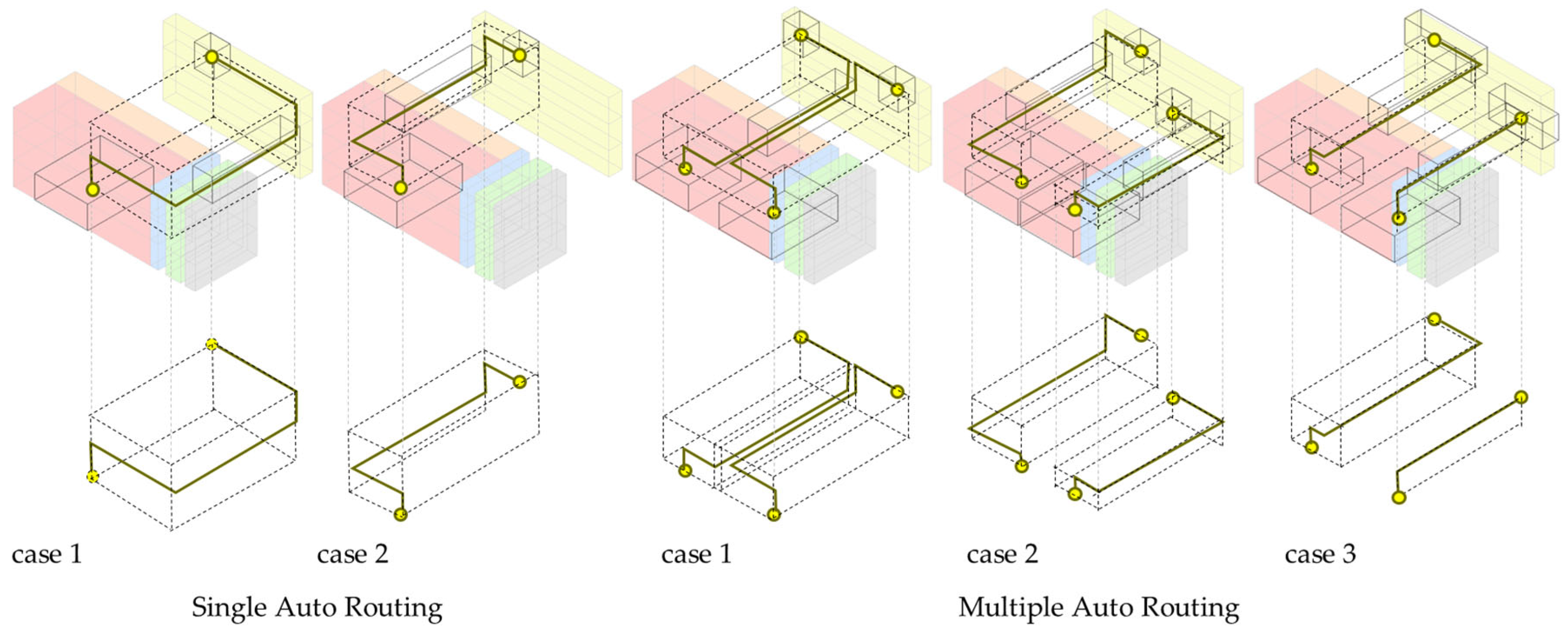 Figure 14 provides a clear visualization of the “minimum bends” strategy, where the algorithm calculates the optimal path that minimizes the number of turns, resulting in simple, straight sections that simplify fabrication. This clearly demonstrates that the framework can “optimize” connection paths based on user-selected criteria, beyond simple point-to-point connection.