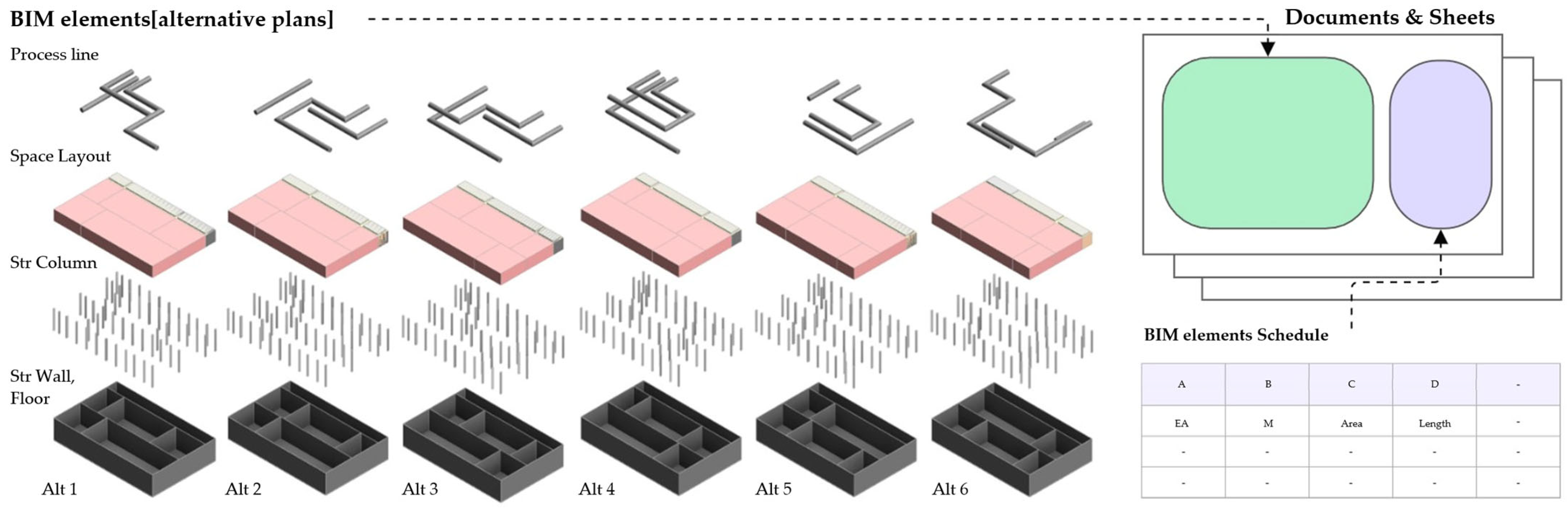 In this chapter, the core functions and automated processes of the proposed GD algorithm are demonstrated. Because of the high security and copyright constraints inherent in semiconductor fab design, the demonstration utilizes a simplified conceptual model rather than sensitive real-world project data. This approach showcases how the framework addresses the Design Bottleneck by proving its operational capabilities without depending on proprietary information, thereby highlighting its key contribution as a data-agnostic optimization process. The use of a conceptual model allows this study to focus on validating the logic and automation of the generative process, rather than the specifics of a single design outcome. This aligns with the paper’s aim to present a methodological framework, verifying the core competencies of automation, rule-based generation, and BIM integration in a controlled, replicable manner. Therefore, the “results” presented herein do not represent a final, optimized fab design. Instead, they signify a successful demonstration of the framework’s primary stages, from initial data input and linkage through algorithmic design generation to the final conversion of a selected alternative into a BIM model. The following sections detail these key stages sequentially, presenting the automated processes and their outputs using visual aids.