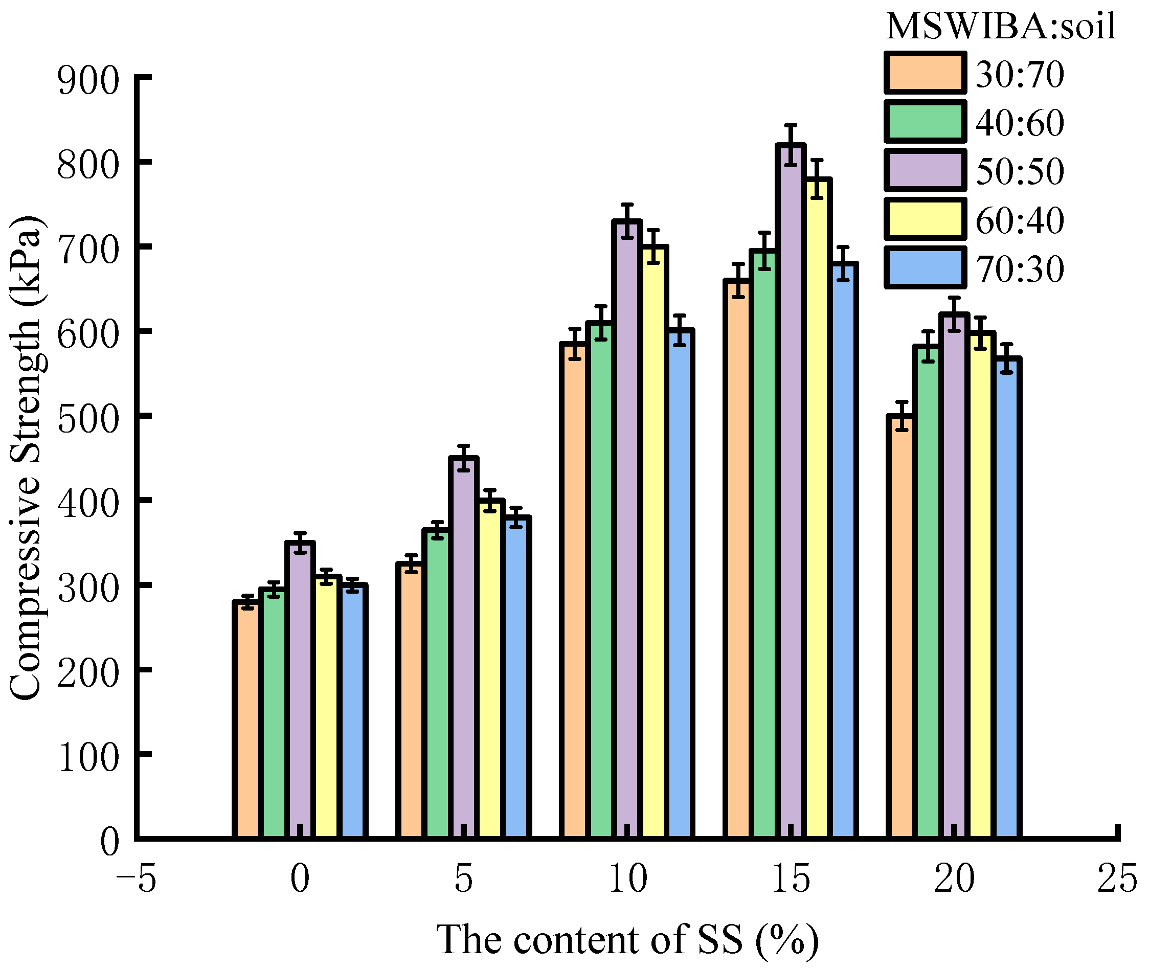 MSWIBA-to-Soil Mass Ratio | Steel Slag Content (%) | Soaking Days (d) Value (Mean ± SD) | ||