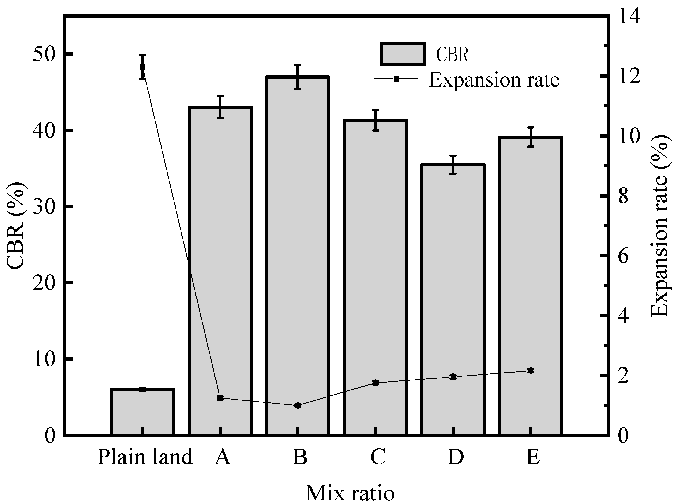 - The optimal mix proportion of steel slag–MSWIBA mixed soil is a 50:50 mass ratio of MSWIBA to natural soil, with an extra 15% steel slag relative to the total mass of MSWIBA and soil. Under this proportion, the 7-day UCS of the mixed soil reaches 0.82 MPa, the 5-day water stability coefficient is 0.91, the strength retention rate after 11 freeze–thaw cycles is 65.3%, the CBR value is 47.1%, and the expansion rate is 1.06%—all satisfying the technical criteria for subgrade fill stipulated in JTG/T F20-2015 Technical Specifications for Construction of Highway Pavement Base Courses and JTG D30-2015 Code for Design of Highway Subgrades.