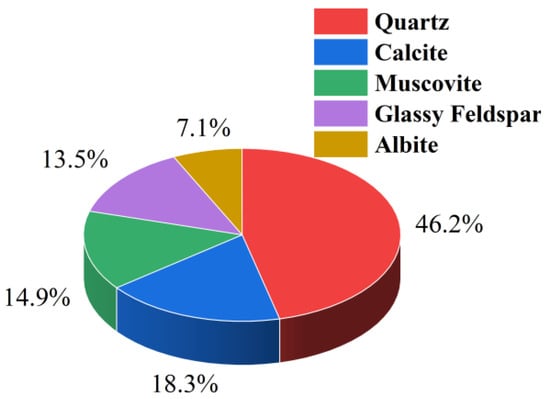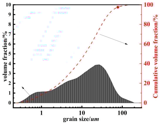 The soil samples used in this study were collected from the loess of a slope in the Yangling Demonstration Zone, Shaanxi Province, at a depth of 3.0~4.0 m below the ground surface. Under extreme rainfall conditions, the loess in this region is prone to inducing hazards such as landslides and subgrade collapse. Therefore, investigating its hydraulic properties holds direct practical significance for safeguarding the safety of regional engineering projects. The physical properties of the soil sample were as follows: optimal water content (weight ratio) = 17.2%, maximum dry density = 1.72 g/cm3, liquid limit (wL) = 32.7%, natural water content = 9.4%, plastic limit (wp) = 18.4%, plasticity index (Ip) = 14.3%, and specific gravity (Gs) = 2.72. The particle size distribution curve was determined using a Bettersize 2000 laser particle size analyzer, as presented in Figure 1; the soil was classified as silty clay. Mineral composition analysis of the soil sample was performed using an intelligent multi-functional X-ray diffractometer (Rigaku, Tokyo, Japan), with the results presented in Figure 2.