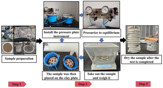 Soil Water Characteristic Test: test data were acquired using Model—1600F1 and Model—1500F2 pressure plate apparatuses manufactured by SOILMOISTURE Equipment Corp. These apparatuses primarily consist of a metal pressure vessel and a saturated ceramic plate with a high air entry value (AEV) of 15 bar, and offer a measurement range of 0.0~1.5 MPa. The steady-state multi-step outflow method is typically employed for measuring SWCCs using pressure plate apparatuses. After applying air pressure to a soil sample, the system is allowed to equilibrate until no further changes in drainage volume are observed over a specified period. Once equilibrium is achieved, the next increment of air pressure is applied. The detailed test procedure is outlined below: (1) Saturation was performed on the prepared soil samples and high air entry value (AEV) ceramic plates. Specifically, the soil samples were saturated using a vacuum saturation method, whereas the AEV ceramic plates were saturated with degassed pressurized water. (2) Saturated ceramic plates were placed on the test stand, and drainage pipes leading to the exterior were connected. Saturated soil samples were then removed, and their mass was measured first. Immediately afterward, the soil samples were placed on the ceramic plates, with care taken to ensure intimate contact between the samples and the ceramic plate surfaces. After the top cover of the pressure vessel was secured, the pressure was adjusted to the predetermined value using a pressure regulating valve. (3) The mass of water-containing volumetric flasks was measured using a precision electronic balance. Equilibrium of the soil sample under the current suction level was indicated by the cessation of water outflow from the sample. At this point, the suction was reduced to zero, and the top cover of the pressure vessel was opened. The mass of each soil sample was then weighed, after which the samples were returned to their original positions and the cover was resecured. The mass of water displaced from the soil sample was calculated from the difference between the mass of the saturated sample and its mass at equilibrium under the current suction level. This mass of displaced water was then converted to determine the volumetric water content of the sample. The above steps were repeated, with the next increment of suction applied sequentially until the entire test was completed. A flowchart of the test procedure is presented in Figure 3.