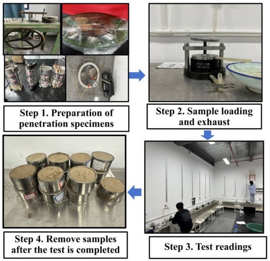 Saturated Permeability Test: The variable-head method was employed to determine the hydraulic conductivity of soil samples in a saturated state. To prevent water leakage through the gap between the soil sample and the permeameter (which would compromise test accuracy), petroleum jelly was applied to the inner surface of the cutting ring prior to sample preparation. Additionally, petroleum jelly was applied to the inner surface of the permeation cell (in contact with the cutting ring) and the rubber gaskets before testing. The experiment was conducted by using the static pressure method to prepare specimens with different initial moisture contents and compaction degrees, with a diameter of 61.8 mm and a height of 40 mm, and then placing them in a stack-type saturation device. These samples (with varying initial water contents and compaction degrees) were placed into stacked saturators. Stacked saturators containing the samples were then placed into a vacuum chamber. The chamber was evacuated using a vacuum pump for at least 1 h, after which water was added to the chamber. Water addition was stopped once the water level completely submerged the top of the stacked saturators, and the samples were allowed to stand for a minimum of 24 h before testing. It is important to note that, prior to testing, stacked saturators containing samples should not be removed from the water bath (used for water immersion saturation) or the vacuum chamber (used for vacuum saturation). Removal would cause moisture evaporation from the samples, which would reduce sample saturation and thereby compromise the accuracy of saturated hydraulic conductivity measurements. During formal testing, samples were quickly removed from the stacked saturators and placed into the permeation cells of the TST-55 permeameters. Additional saturation was maintained for 5–10 min before the test was initiated, as presented in Figure 4.