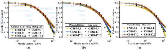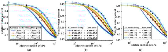 Fitting of soil water characteristic dehumidification curves by three models. (a) Gardner model fitting curve; (b) FX model fitting curve; (c) VG model fitting curve.