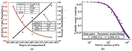 The most suitable VG model was employed in this study for parameter analysis. Figure 6 illustrates the variation trends of the VG model’s fitting parameters with increasing compaction degree.