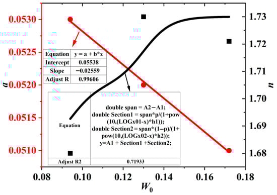 As observed in Figure 8, the parameter a decreased with increasing initial water content, and the relationship between these two variables was well described by a correlation equation. In contrast, the parameter n exhibited minimal variation, and the correlation equation derived from its data had a low coefficient of determination. Consequently, no predictive model for the parameter n with respect to initial water content was developed in this study at this time.