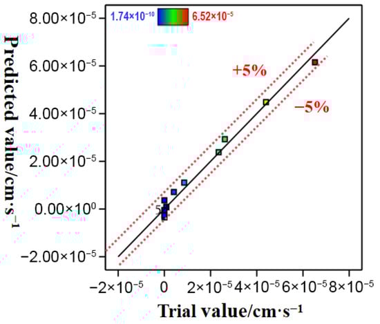 A comparison of the predicted values (derived from the aforementioned equation) and measured values for all experimental points is presented in Figure 11. As observed, the predicted and measured values for all experimental points were generally distributed along a straight line. This distribution indicates a high degree of agreement between the experimental results and model predictions, confirming that the hydraulic conductivity prediction model developed via the response surface methodology (RSM) is reliable.