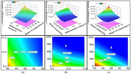 As shown in Figure 12b, the response surface diagram is very steep. With the increase in initial water content, the permeability coefficient shows a downward trend as a whole, while with the increase in matrix suction, the permeability coefficient decreases faster. In contrast, matrix suction has a greater impact on the results, which is consistent with the significance order of the two factors. It can be seen from Figure 12c that the permeability coefficient shows a downward trend with the increase in compactness, and the rate of decline continues to decrease with the increase in matrix suction.