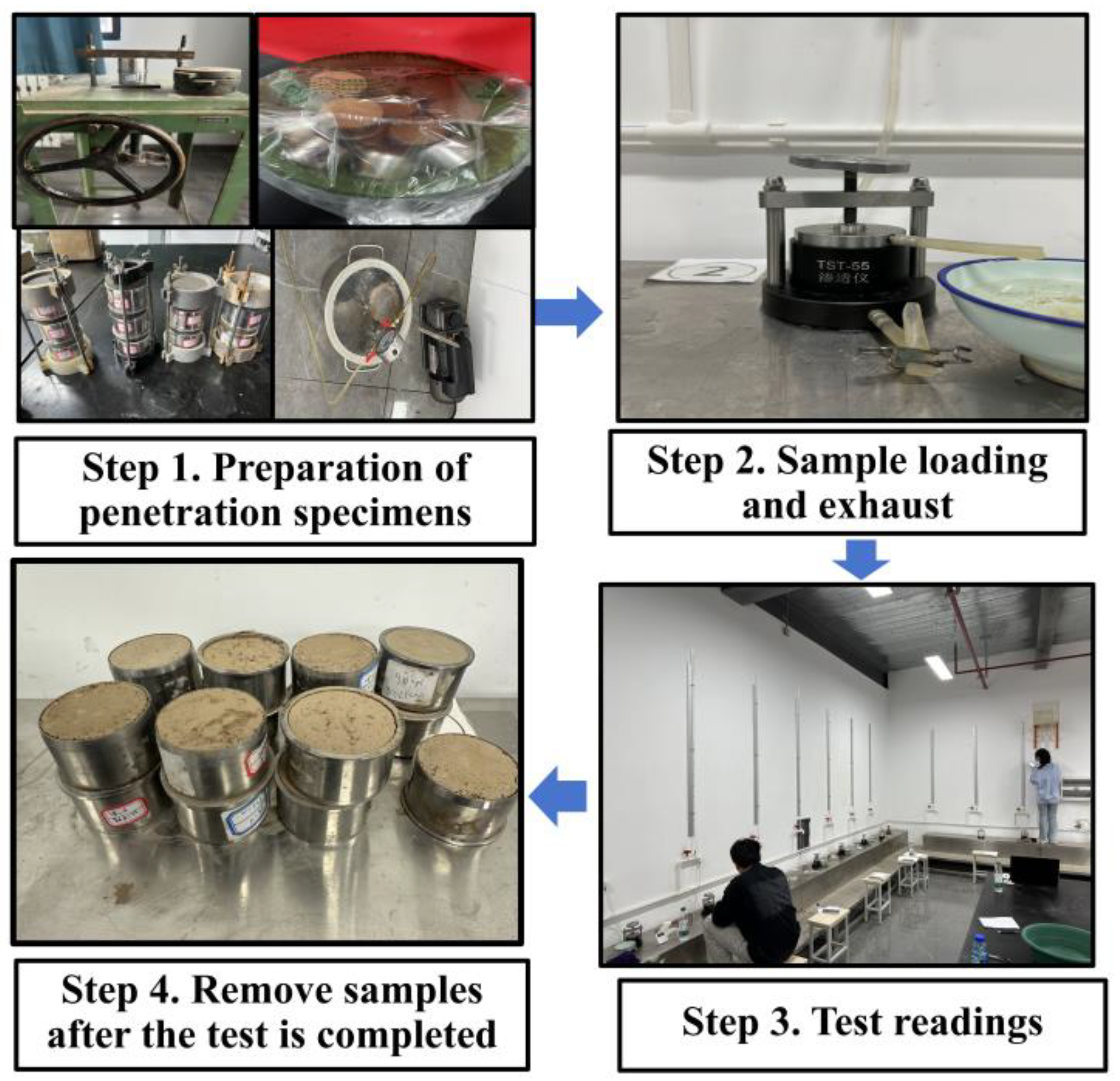 18] utilized the experimental principle of the wetting front advance method to calculate the unsaturated hydraulic conductivity. This calculation was based on volumetric water content, matric suction, wetting front movement velocity, and the time interval of data collected by soil moisture sensors. Their results indicated that as dry density and salt content increased, the unsaturated hydraulic conductivity of loess-like sulfate saline soil gradually decreased, with this trend being most pronounced in the low suction range. Studies by Wang et al. [