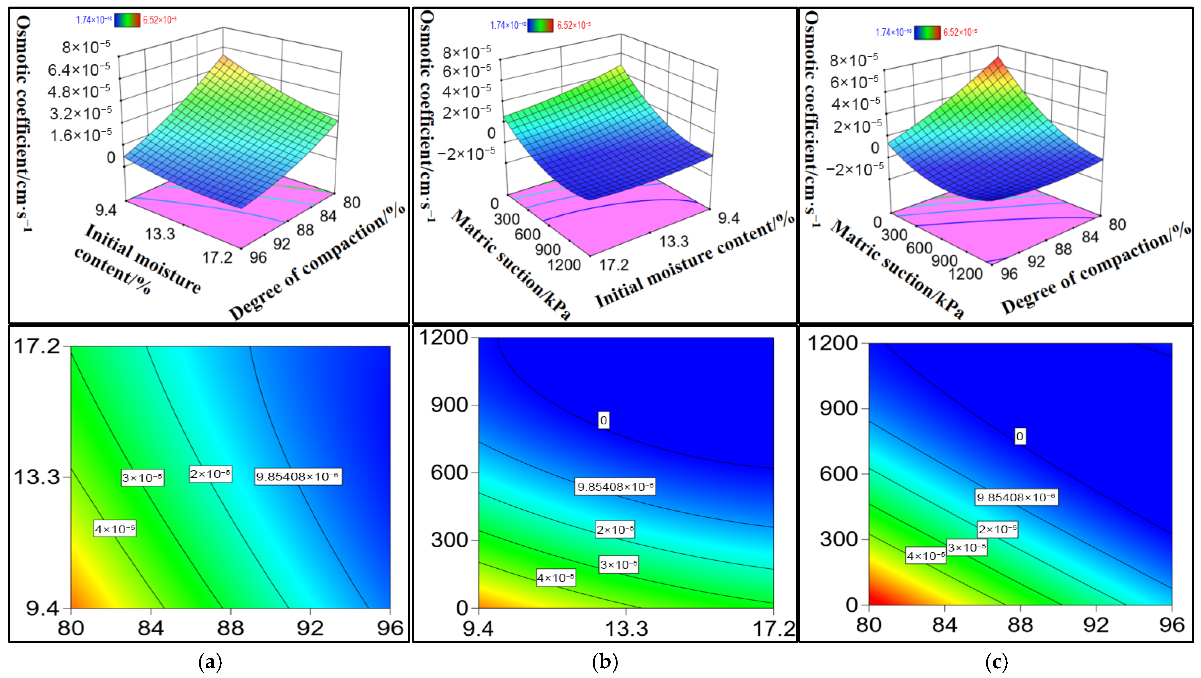 The permeability coefficient prediction model based on the response surface method has a determination coefficient R2 of 0.9861, which can quickly and accurately predict the permeability coefficient of Yangling loess. The order of influence weight of each factor on the permeability coefficient is matrix suction > initial compaction > initial water content. The dominant influencing factors of permeability characteristics under the coupling effect of multiple factors were identified.