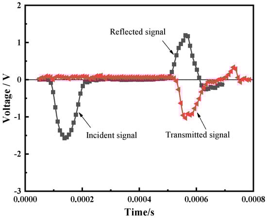 During the test, the impact of the projectile on the incident bar generates an incident wave. When the incident wave reaches the contact surface between the incident bar and the specimen, part of the stress wave is reflected to form a reflected wave, while the other part penetrates the specimen and propagates toward the transmission bar to form a transmitted wave. A rubber sheet with a diameter of 20 mm was used as the waveform shaper, and finally, the obtained waveform diagram is shown in Figure 2. Strain gauges were attached to the middle positions of the incident bar and the transmission bar to measure the strain under impact loading.