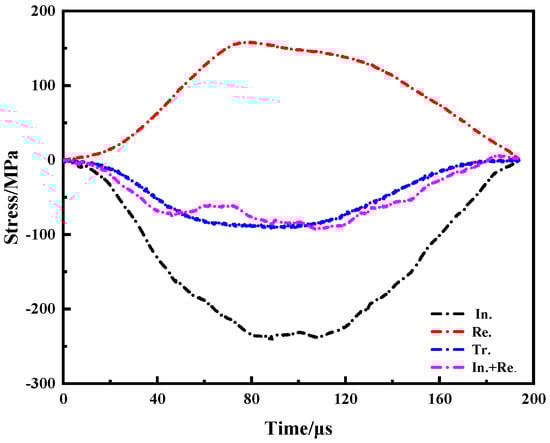 For the SHPB test, stress balance before the failure of the rock specimen is a prerequisite for effective test results []. It can be verified by comparing the dynamic stress at both ends of the rock sample during the loading process. As shown in Figure 3, the curve of the sum of the incident wave and the reflected wave almost coincides with the transmission wave curve, which indicates that the loads at both ends of the rock sample are equal before the peak. In this case, the axial inertia effect of the sample can be ignored, so it can be considered that the sample has reached the stress balance state, and the test results are effective. In the test, all the test results are strictly verified by stress balance, and the results that do not meet the requirements will be eliminated.