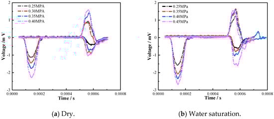 Figure 4 shows the incident wave, reflected wave, and transmitted wave of dry and water-saturated skarn under different impact pressures. It can be seen from the diagram that the impact pressure and water have a significant effect on the rock stress wave waveform. When the rock is dry or water-saturated, the amplitude values of the incident wave, reflected wave, and transmitted wave increase with the increase in impact pressure. Under the same impact pressure, that is, under the same incident wave condition, the reflected wave amplitude of water-saturated rock is higher than that under the dry condition, while the transmitted wave amplitude is lower than that under the dry condition. According to one-dimensional stress wave theory, the wave impedance of the water-saturated specimen is lower than that in the dry state, which is manifested by the increase in the reflected tensile wave and the decrease in the compressive wave. The stress wave transmitted through the specimen to the transmission rod is reduced, which is mainly manifested by the decrease in the amplitude of the reflected wave and the decrease in the amplitude of the transmitted wave.