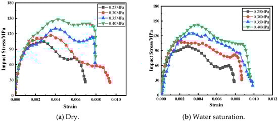 The dynamic compressive stress–strain curves of skarn specimens under dry and water-saturated conditions are shown in Figure 5. It can be seen that under the same impact load, the dynamic compression stress–strain curves of dry and water-saturated skarn specimens are basically the same, which can be roughly divided into four stages. The first stage is the crack compaction stage. At this stage, the curve is concave, which is mainly caused by the closure of microcracks inside the skarn specimen caused by external load. Under dynamic load, the duration of this stage is very short, so it is not obvious on the stress–strain curve. The second stage is the elastic stage. The curve at this stage is approximately a straight line, and the corresponding slope is the dynamic elastic modulus of the skarn specimen. The slope of the curve increases with the increase in the impact pressure, and the slope of the curve of the water-saturated specimen is smaller than that of the dry state. The third stage is the plastic deformation stage. At this stage, the curve is convex, and the slope of the curve gradually decreases. When the peak value of the curve is reached, the slope is 0. The fourth stage is the failure stage, and the slope of the curve is negative. In this stage, the dry state is different from the water-saturated state. In the dry state, the curve shows the phenomenon of “stress drop”, and the skarn specimen shows obvious brittle characteristics. The time curve of water-saturated skarn becomes slower, and the rock changes from brittleness to plasticity. This shows that the existence of water changes the mechanical properties of rock.