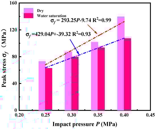 In order to quantitatively study the influence of dry and water saturation conditions on the peak stress of skarn specimens, a histogram of the peak stress and impact load of skarn specimens was drawn and fitted, as shown in Figure 6.