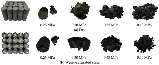 (1) The degree of fragmentation intensifies with impact pressure. Under the same loading conditions, water-saturated specimens display finer fragment distributions and higher fractal dimensions, reflecting a more severe damage state than dry specimens. Water saturation thus accelerates the transition from brittle fracture to ductile failure and weakens the rock’s resistance to dynamic crushing.