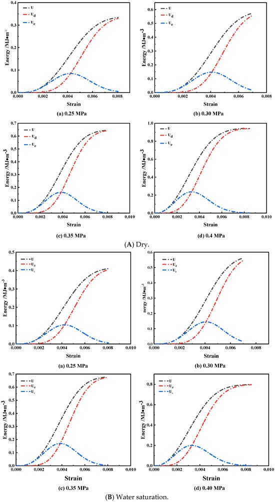 The relationship between total strain energy per unit volume, releasable elastic strain energy, and dissipated energy with strain during dynamic impact under dry and water-saturated conditions is shown in Figure 8. The total strain energy and dissipation energy per unit volume of skarn increase with the increase in strain, and the growth rate first rises gradually, then tends to be stable. The released elastic strain energy first increases and then decreases with the increase in strain. The energy evolution of skarn with strain during impact can be divided into four stages. In stage I, the total strain energy of the skarn element is not significantly increased, which is due to the fact that the specimen is in the pore compaction stage, at which time the strain continues to increase, but the stress increases relatively slowly. The total strain energy and the released elastic strain energy of the skarn element in the second stage increase synchronously, and the dissipated energy is almost not accumulated. At this time, the skarn is in the stage of elastic deformation, with almost no plastic deformation. The total strain energy is stored in the skarn as elastic energy. In the third stage, the dissipated energy of the skarn unit begins to accumulate, which means that the specimen begins to enter the plastic stage, and the initial crack expands and is accompanied by the formation of new cracks, which gradually produces a large amount of plastic deformation. The starting point of this stage can be called the “crack initiation point” []. Stage IV is called the failure stage. In this stage, the skarn produces macroscopic damage, and its bearing capacity decreases. The stress in the skarn begins to drop, and the elastic strain energy cannot continue to accumulate and instead begins to be released. The released elastic strain energy is completely converted into dissipated energy, and the total strain energy tends to remain unchanged after a continuous increase. Therefore, similarly to the deformation stage of skarn, the energy evolution curve can also be divided into four stages: the pore compaction stage, elastic deformation stage, plastic stage, and rock failure stage [,,].