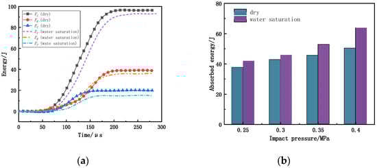 In the SHPB test, regardless of whether the specimens are in the dry or saturated state, the energy variation process shows a three-stage growth pattern, as illustrated in Figure 9a. Stage 1: Low-speed growth stage. With the increase in time, the energy of the incident wave, reflected wave, and transmitted wave gradually starts to increase at a low speed. Stage 2: High-speed growth stage. The energy of the incident wave, transmitted wave, and reflected wave increases linearly. Stage 3: Stable stage. After growing to a certain time point, the energy of the incident wave, reflected wave, and transmitted wave all tend to stabilize. In the stable stage, the incident energy, reflected energy, and transmitted energy of the specimens in the dry state are higher than those in the saturated state. During the test, the energy of the incident wave is greater than the sum of the energy of the reflected wave and the transmitted wave. The difference between the two (incident wave energy minus the sum of reflected and transmitted wave energy) represents the energy consumed for rock failure during the impact process, i.e., the energy absorbed by the specimen. Figure 9b shows the variation curve of the energy absorbed by the specimens. It can be observed that although the incident energy of the dry specimens is higher than that of the saturated specimens, the energy absorbed by the saturated specimens is greater. This further explains why the saturated specimens exhibit a higher degree of damage under the same impact pressure condition.