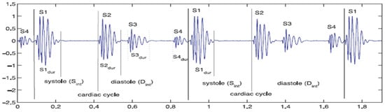 Segmentation is a method that divides datasets, images, or signals into more meaningful and processable parts to facilitate their interpretation and analysis. In heart sound analysis, segmentation plays a crucial role in isolating the fundamental components of the cardiac cycle, enabling the identification of specific abnormalities. Heart sounds, which can be heard using a stethoscope, provide essential information about the cardiovascular system and play a critical role in disease diagnosis. As shown in Figure 2, heart sound signals consist primarily of two components: S1 and S2. The S1 sound is associated with the closure of the mitral and tricuspid valves [25], marking the beginning of systole, while the S2 sound corresponds to the closure of the aortic and pulmonary valves, indicating the beginning of diastole [26]. While these two heart sounds are clearly distinguishable in healthy individuals, additional sounds such as S3 and S4 may appear under certain pathological conditions.