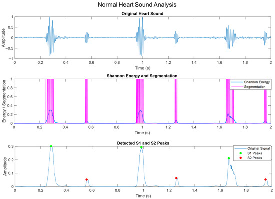 Due to the absence of precisely annotated heart sound segments (e.g., S1 and S2 onset and offset times) in the datasets used, quantitative performance metrics such as onset timing error, detection rate, sensitivity, and specificity of the segmentation method could not be calculated explicitly. However, visual inspections and qualitative analysis confirmed that the proposed Shannon energy- and Otsu threshold-based segmentation consistently and accurately isolated primary heart sound components across most recordings. Future research should involve datasets with detailed segment annotations to facilitate rigorous quantitative validation and further assess the robustness of the segmentation approach, particularly for pathological cases that may contain additional heart sound components (e.g., S3 and S4).