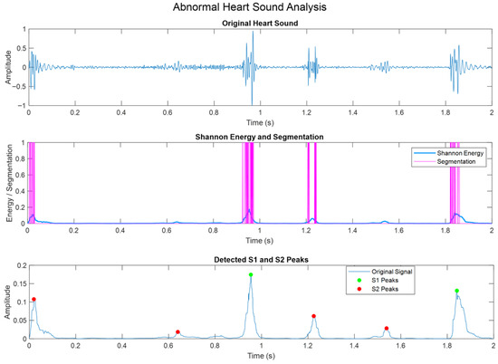 A key limitation of this study stems from the unavailability of ground-truth segment annotations (e.g., S1 and S2 boundaries) in the Pascal dataset, which precludes formal quantitative evaluation of segmentation accuracy using metrics such as onset timing error or sensitivity in that cohort. For Pascal, segmentation quality was assessed indirectly via visual inspection and its effect on downstream classification performance. In certain abnormal cases, as shown in Figure 3, S2 peaks may be attenuated or missed due to low-amplitude or transient noise, revealing the sensitivity of energy-based segmentation methods to pathological variations. To address this, future studies should employ datasets with annotated cardiac events to enable rigorous validation and explore more advanced segmentation techniques (e.g., Hidden Semi-Markov Models or deep learning-based approaches). Additionally, hybrid feature extraction strategies and larger, more diverse datasets may improve robustness and generalizability.