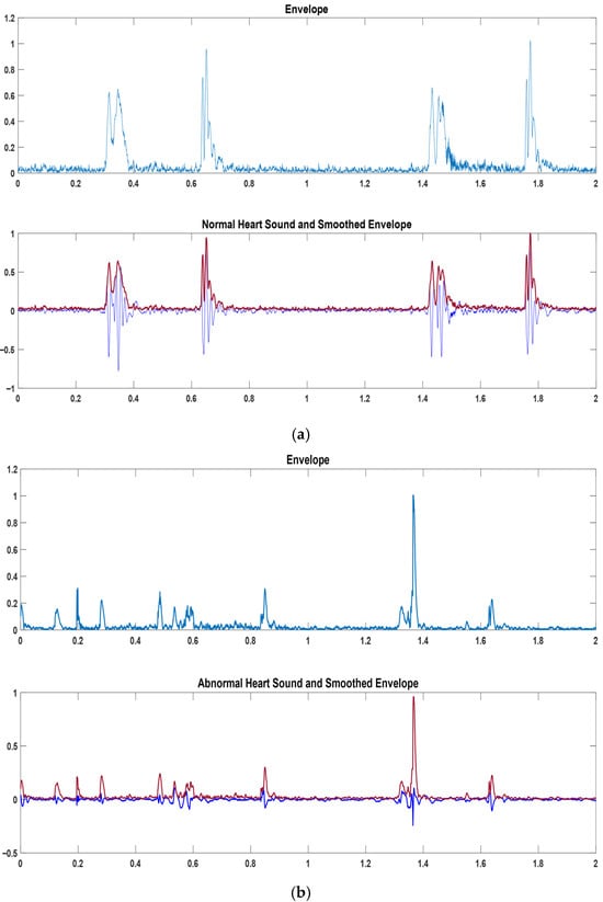 Visualization of the peak detection process and suppression of false positives. (a) Illustration of a normal heart sound signal. (b) Illustration of an abnormal heart sound signal.