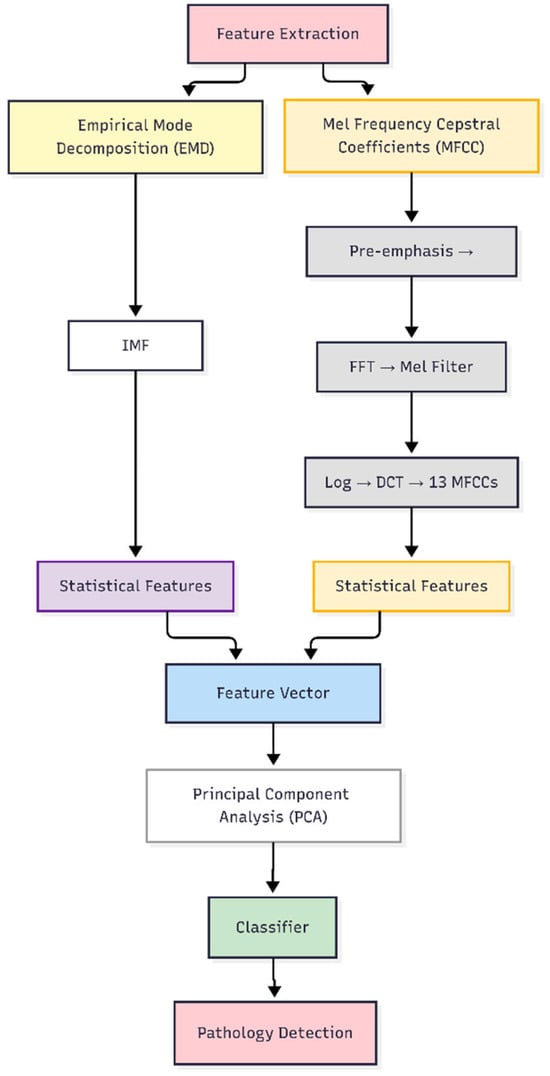 Although some features such as mode and maximum may exhibit statistical correlation, their inclusion ensures comprehensive coverage of both central and extreme values within the signal. This carefully curated set of statistical descriptors offers a balance between computational efficiency and classification performance. To ensure consistency across domains, the same statistical feature set was applied to both MFCC- and EMD-based representations. The entire process of feature extraction and summarization is illustrated in Figure 6.