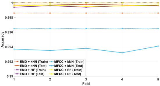 Among classifiers, kNN and Random Forest consistently outperformed SVM, with the highest performance achieved using kNN with segmented MFCCs (99.37%) and kNN with segmented EMD (99.97%). In contrast, SVM performed significantly lower on non-segmented data (81.88% accuracy for MFCCs, 71.76% for EMD). Other approaches in the literature include a CNN-RNN hybrid model with 98% accuracy [13] and a Decision Tree model with 86.35% accuracy [14]. The combination of SVM, kNN, and RF classifiers in [15] achieved 98.67% accuracy. These comparisons show that carefully designed traditional machine learning pipelines can surpass deep learning approaches when combined with effective segmentation and feature extraction techniques.