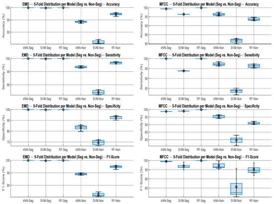Notably, although relatively simple classifiers were used, the incorporation of segmentation and appropriate feature extraction significantly enhanced model performance. For example, the accuracy of the EMD + kNN model increased from 88.40% to 99.97% with segmentation. These findings confirm that the reported high accuracy values are not superficial but arise from a carefully designed and comprehensive pipeline that integrates robust preprocessing, segmentation, and balanced learning strategies.
