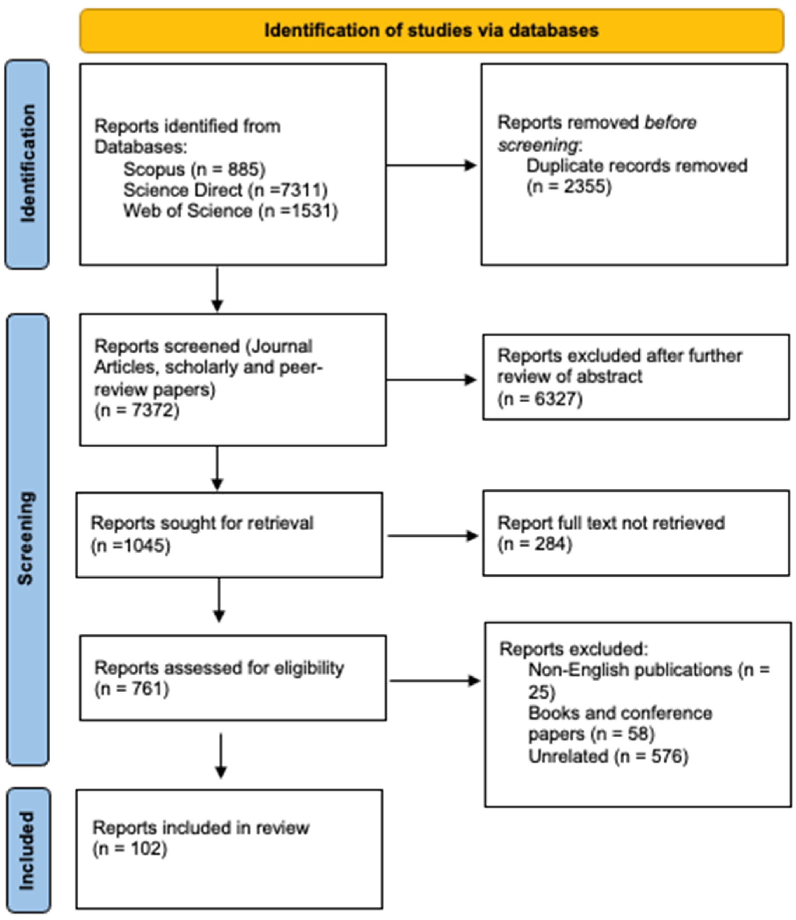 - Identification: The research articles were searched on Scopus, Web of Science, and ScienceDirect using titles, keywords, and abstracts.