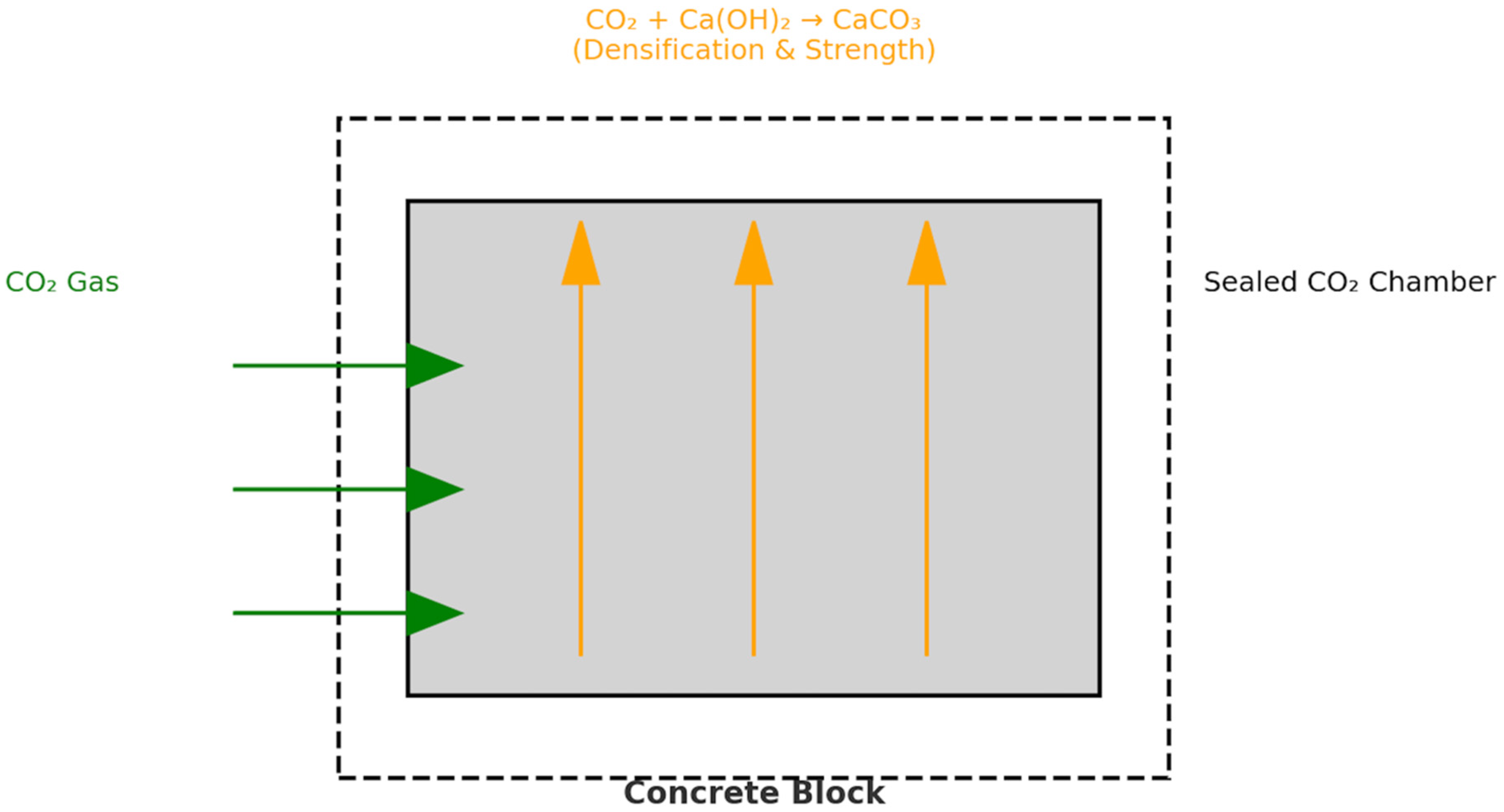 | OPC, GGBS, phosphogypsum | Precast concrete | 0.5–1 h 99% CO2 3 bar pressure | Improved durability, densified matrix with CaCO3 | [79] |