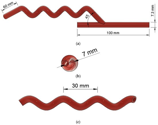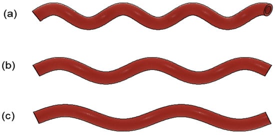 Sample helical arterial bypass graft model with varying helical pitches. (a) HP = 30 mm; (b) HP = 40 mm; (c) HP = 50 mm.