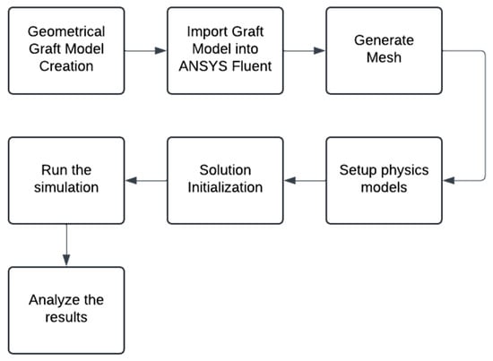 To analyze the effect of the anastomosis angle (AA), helical diameter (HD), and helical pitch (HP) on the helical arterial bypass graft, both steady-state and transient CFD simulation was conducted using the ANSYS Fluent 2025 Student Version, process is summarized in Figure 4. A steady-state CFD simulation characterized hemodynamic parameters, including area-weighted average wall shear stress (AWA-WSS), pressure drop, and helicity. On the other hand, transient CFD simulation was employed to offer time-dependent hemodynamic parameters, including time-average wall shear stress (TAWSS), oscillatory shear index (OSI), and relative residence time (RRT). The 3D graft models were discretized into a computational mesh for CFD analysis, and appropriate boundary conditions were defined to govern fluid flow through the graft.