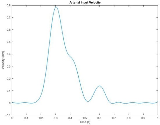 The arterial inlet velocity reported in the literature illustrated in Figure 7 on arteriovenous grafts was adopted as the inlet boundary condition in this research [16]. The transient simulation in ANSYS Fluent was executed for three initial periods to stabilize the residuals, after which data sampling was performed during the fourth period. Each period consisted of 25 time steps, with a maximum of 20 iterations per time step.