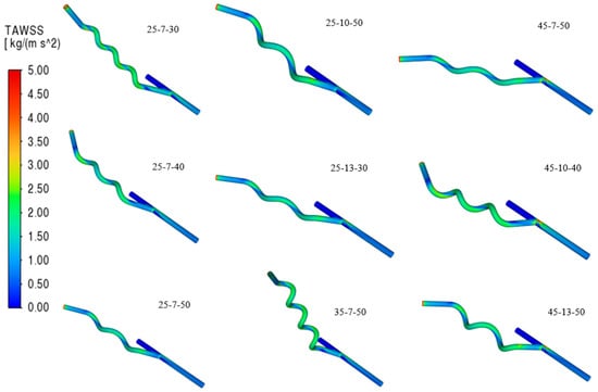 Contours of Time-Averaged Wall Shear Stress (TAWSS).