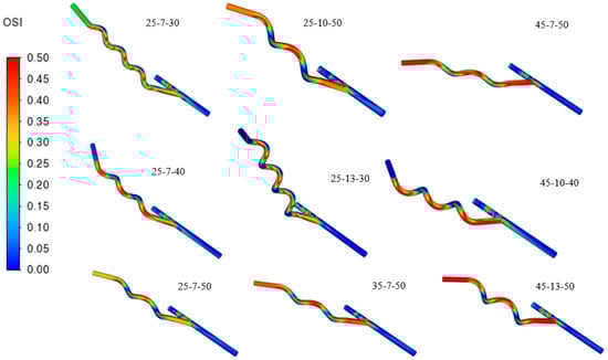 Summarized in Table 7 are the compiled grafts with the best performance from the steady-steady state simulation from stage 1 of this study, subject to further simulation to capture the effect of transient time-dependent simulation on the graft, and to further analyze the best helical arteriovenous bypass graft. It is evident from Table 7 described as well in Figure 12 that increasing the helical pitch, observed in 25-7-(30,40,50), decreases TAWSS. A higher helical pitch performs closer to a straight tube, which has a weaker swirling and mixing, resulting in a streamlined flow, so the near-wall velocity gradient decreases. This phenomenon is also evident in the 45-(10,13)-(40,50) model. Also, a lower anastomosis angle results in a higher TAWSS. Moreover, OSI reveals the strength of the changes in the direction of wall shear stress changes and can have a value from 0 to 0.5; typically, a value of 0.5 correlates to atherosclerosis or thrombosis [29].