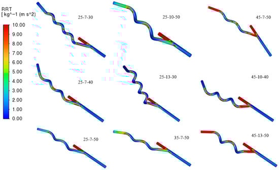 Evident from Figure 13, increasing the helical pitch results in a higher OSI in the flow of the graft, considering that it loses the swirling flow, stabilizing the hemodynamics of the blood, meaning blood can decelerate and recirculate near the wall. These recirculation cause changes in shear stress direction during the cardiac cycle. Similarly, grafts with higher anastomosis angles exhibit elevated OSI values due to the sharper entry of blood into the host vessel, which promotes flow separation and the formation of vortical structures. A high pitch and a large angle amplify oscillatory shear, creating disturbed flow regions strongly associated with thrombosis and atherosclerosis. Moreover, relative residence time (RRT) also increases in areas with low TAWSS and high OSI since blood particles remain near the wall for prolonged periods depicted in Figure 14. Grafts with high pitch or high angle show greater RRT values, highlighting the strong connection between these hemodynamic indices.