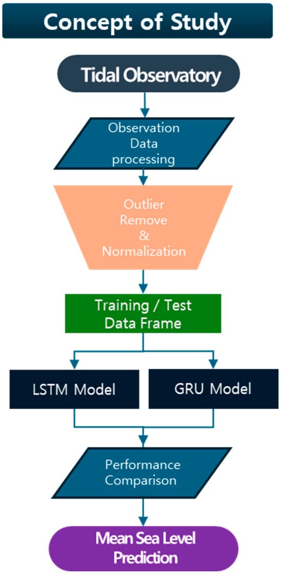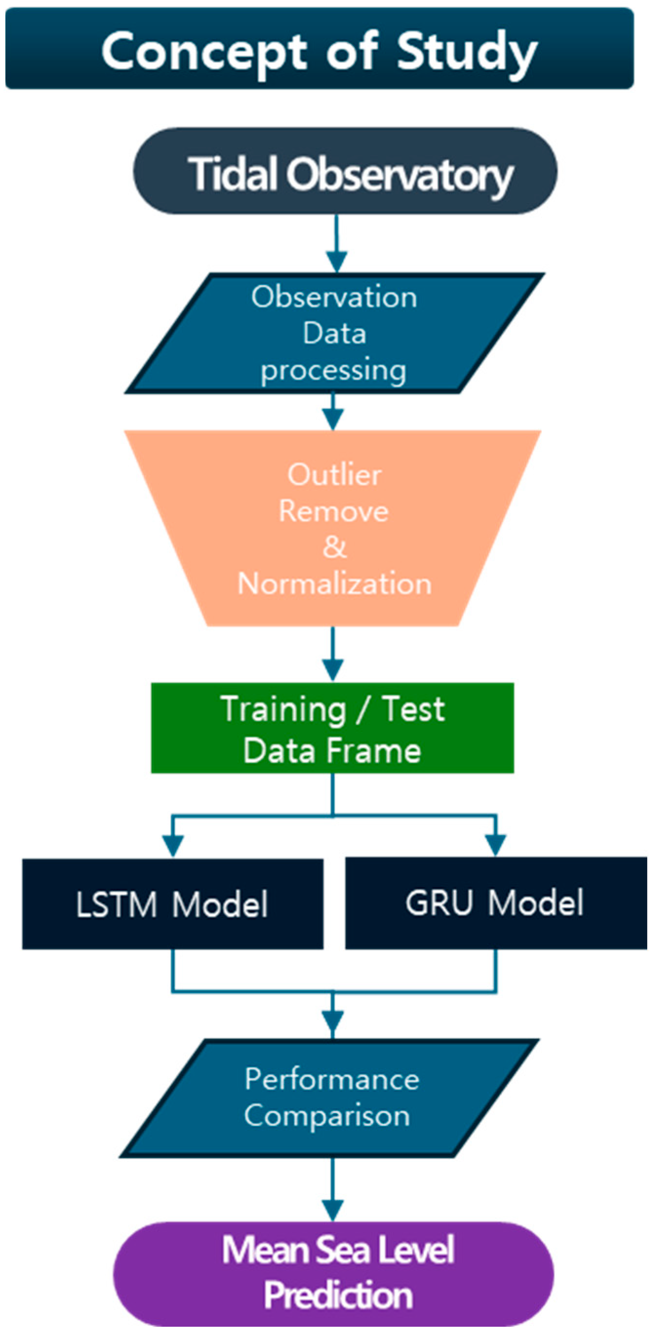 This study aims to estimate long-term mean sea level trends in the East Sea (Sea of Korea) of the Republic of Korea using deep learning techniques. As illustrated in Figure 1, observational data from tidal observatories are first preprocessed through outlier removal and normalization. The resulting time series are divided into training and test sets, which are used to build and evaluate two recurrent neural network (RNN) architectures—Long Short-Term Memory (LSTM) and Gated Recurrent Unit (GRU) models. A comparative performance analysis is then conducted to assess their suitability for coastal MSL prediction. By focusing on the tectonically sensitive East Sea region, this research contributes to the development of adaptable deep learning workflows for sea level forecasting and vertical datum refinement in the Republic of Korea.
