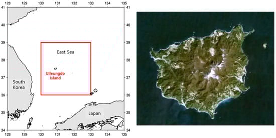 Figure 2 shows Geographical location and satellite view of Ulleungdo Island in the East Sea (Sea of Korea). The left panel shows the regional context of Ulleungdo, situated approximately 120 km east of the Korean Peninsula within the East Sea. The red box highlights the study area used for sea level trend analysis. The right panel presents a high-resolution satellite image of Ulleungdo Island, which serves as the primary location for tide gauge observations and vertical datum assessment in this study.