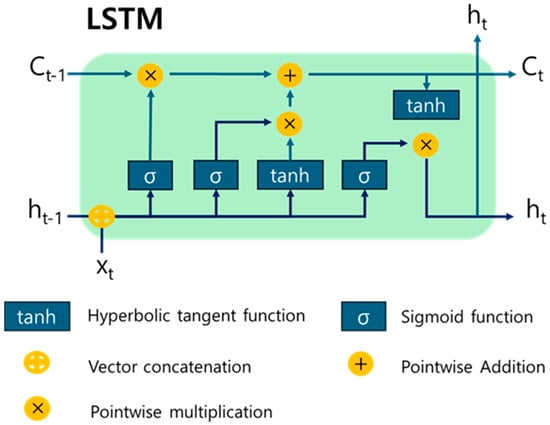 Compared to traditional neural networks, the LSTM network includes additional components such as cells, input gates, output gates, and forget gates. The cell is a component that preserves memory according to the unit time of the given input data. The input gate is a neural network layer that regulates data flow into the cell. The output gate functions similarly but regulates the flow of data out of the cell. The forget gate is used to erase unnecessary memories.