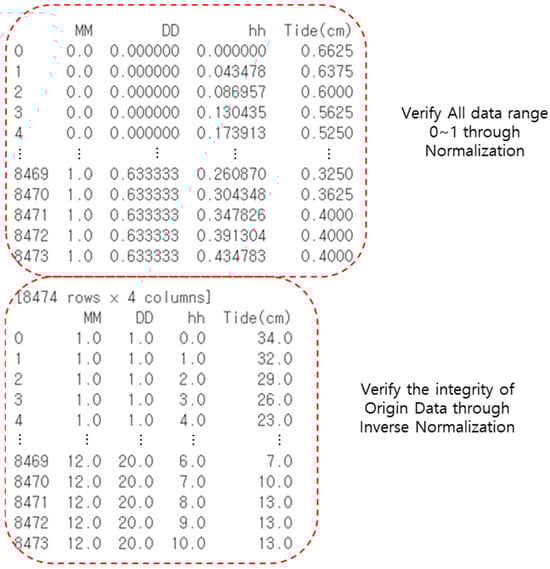 The outcomes of this verification are presented in Figure 5. The upper panel illustrates the results of min–max normalization, where all data attributes were effectively scaled to the designated [0, 1] interval, thereby standardizing the feature space for subsequent model training. In contrast, the lower panel displays the results of inverse normalization, confirming that the original data structure and distribution were perfectly preserved through the bidirectional transformation process. No significant deviation, bias, or distortion was observed, validating the mathematical correctness and reversibility of the normalization scheme.