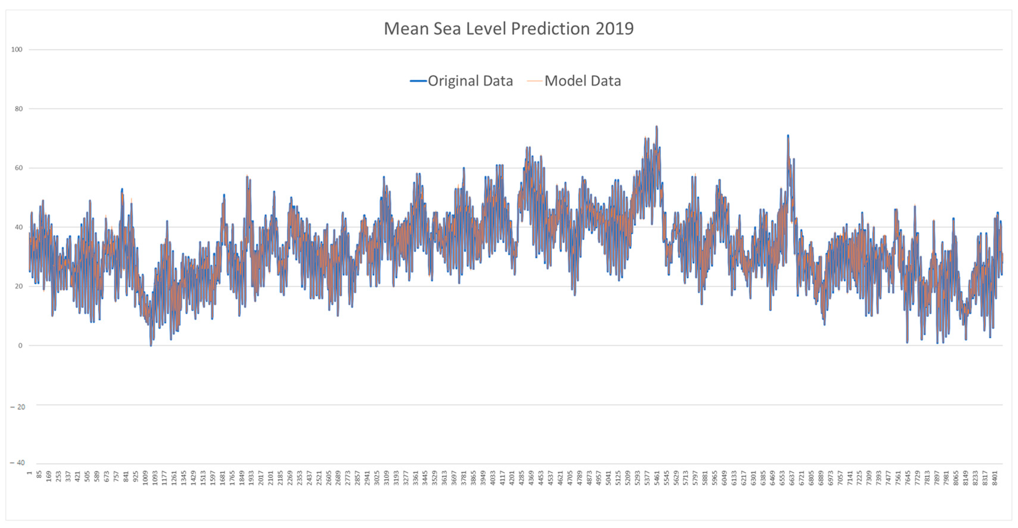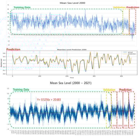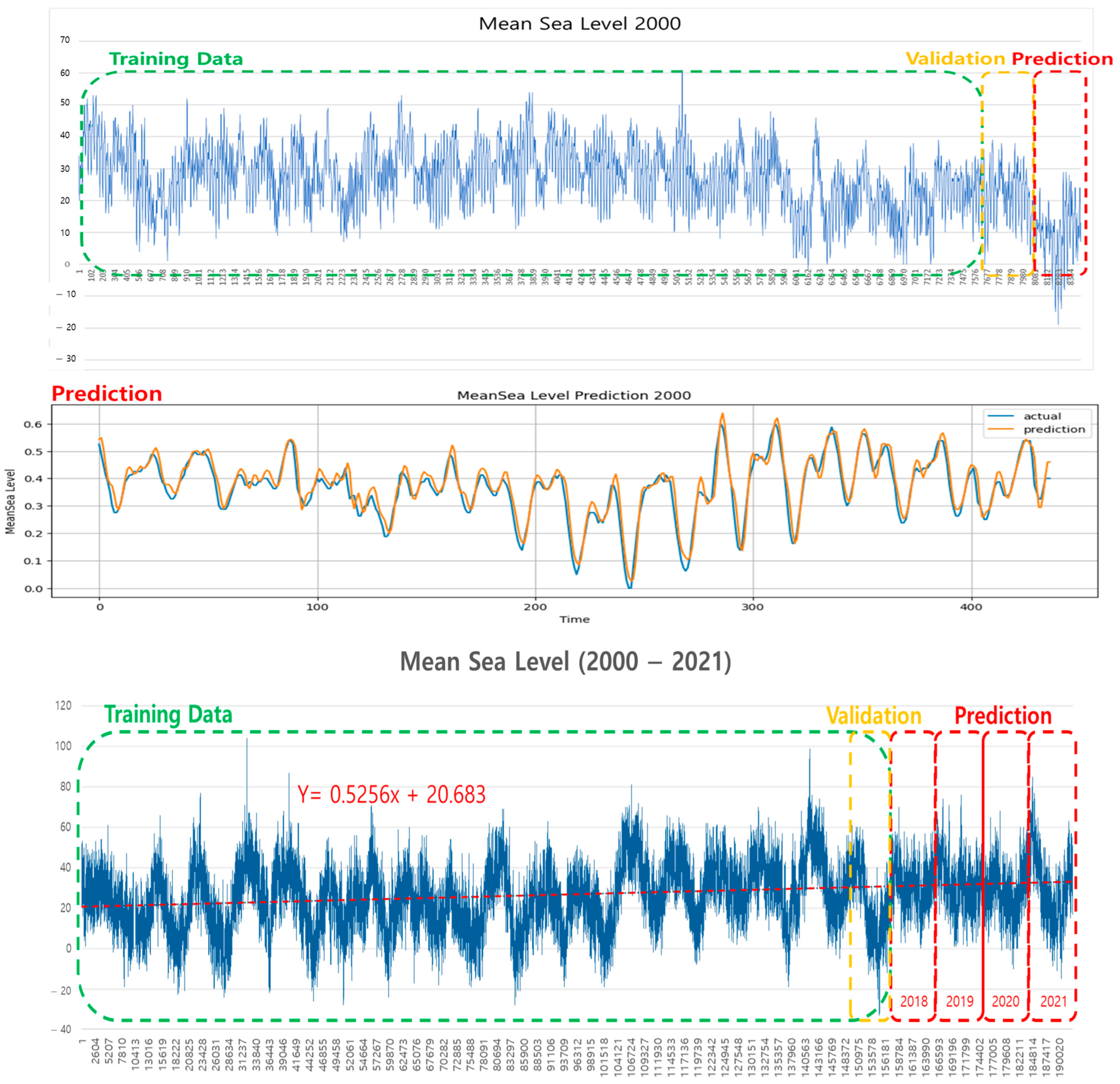 In this method, the input gate incorporates periodic and consistent movements such as the gravitational motion of the sun and moon, the annual movement of tectonic plates, and seasonal changes in wind speed and direction. The output gate is set to the long-term sea level change over 21 years used in this study, thereby enabling an integrated prediction of various factors influencing the mean sea level. Theoretically, the relative positions of the sun and moon can be reflected on an hourly basis, and factors such as wind speed and direction, mean sea-level pressure, and near-surface air temperature can be incorporated to account for seasonality in sea level, allowing for more accurate predictions of future mean sea level variations.