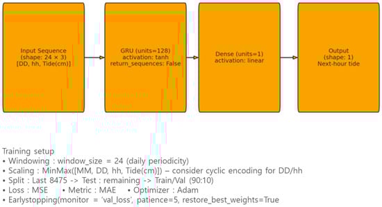 In this study, the predictive performance of the LSTM and GRU models was evaluated using hourly tide observations collected from 2000 to 2018. Each annual dataset contained approximately 8760 data points, and the entire dataset comprised 192,720 hourly observations (19 years × 8760 h). The data were divided into training, validation, and test subsets with a ratio of 90%:5%:5%.