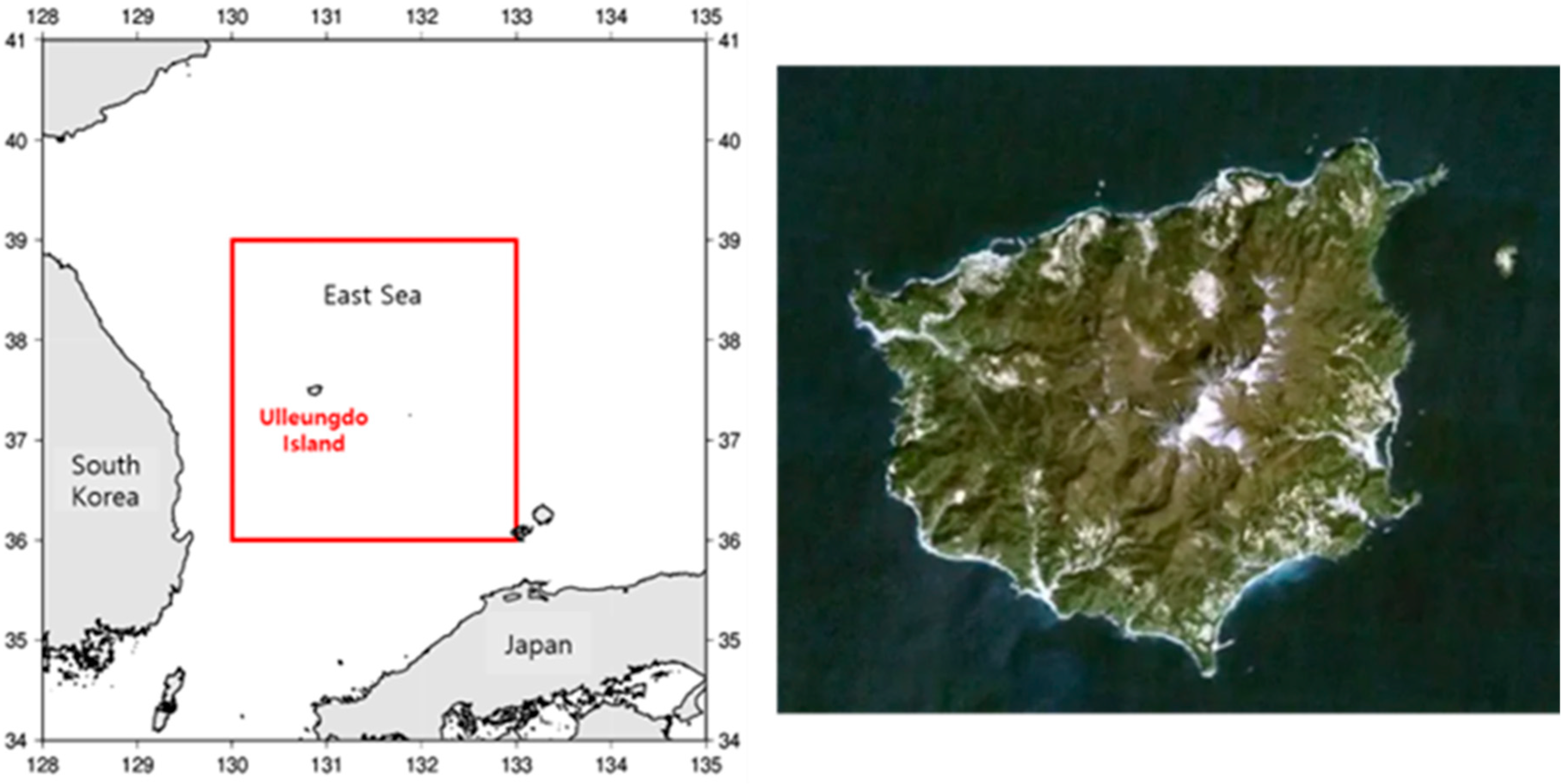 Figure 2. Location map and satellite image of Ulleungdo Island in the East Sea, about 120 km east of the Korean Peninsula, showing the study area for sea level trend analysis and the primary tide gauge observation site.