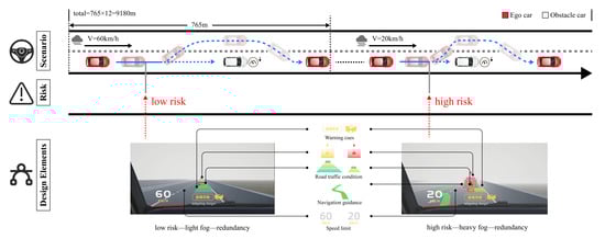 Information redundancy is a key design element in enhancing the perception of information accuracy []. Appropriate redundancy can present critical information through multiple channels, increasing its visibility and comprehensibility, thereby improving drivers’ perceptual abilities within the driving environment. In driving, redundancy is commonly manifested in two primary ways: ①. Multisensory Information Presentation. In emergencies, drivers may be under high stress, and their visual attention could be diverted. The information’s perceptibility is enhanced by conveying key information visually on the HUD and through auditory and haptic means. ②. Repetition and Emphasis of Information. During emergencies, the importance of certain key information becomes more pronounced. Presenting this critical information repeatedly, in different locations and manners, increases drivers’ attention and aids in shorter response time.